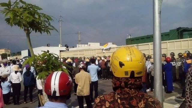 Hình ảnh cho thấy một lực lượng rất đông đảo Cảnh Sát Cơ Động đứng chắn ngang sát tường rào của cơ sở Formosa.