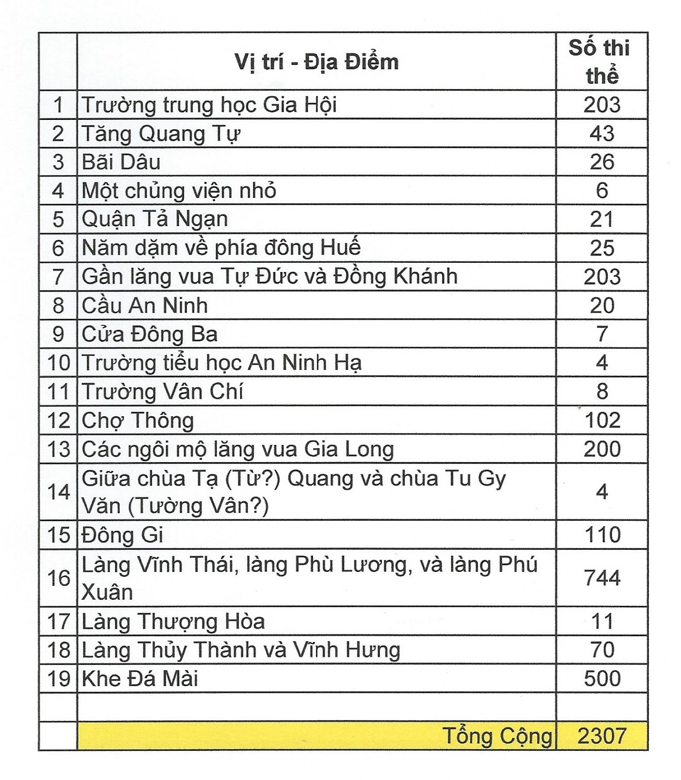 15) Địa điểm số 15 (Hình 9): Đông Gi, 16 km trực tiếp phía đông Huế (tlđd.). 110 xác, tất cả là đàn ông và "hầu hết bị trói tay và giẻ nhét vào miệng."