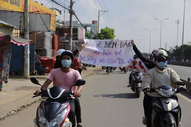 Tại Sài Gòn: Một hình thức biểu tình mới đã được một nhóm bạn trẻ thực hiện. Nhóm bạn trẻ này mặc áo có hình lưỡi bò bị cắt và đi trên đường phố bằng những chiếc xe gắn máy. Khẩu hiệu được các bạn mang theo có nội dung “Trường Sa- Hoàng Sa là của Việt Nam”, “Yêu nước là phải khởi kiện Trung cộng”, “Việt Nam xấu hổ với Philippines”.