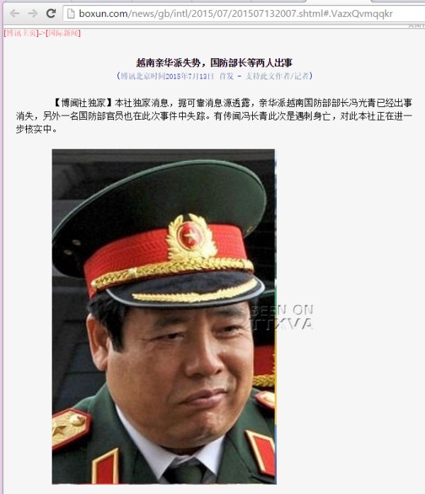 | Đại tướng Bộ trưởng Quốc phòng csVN Phùng Quang Thanh được Báo Trung Quốc nói "đã biến mất". |